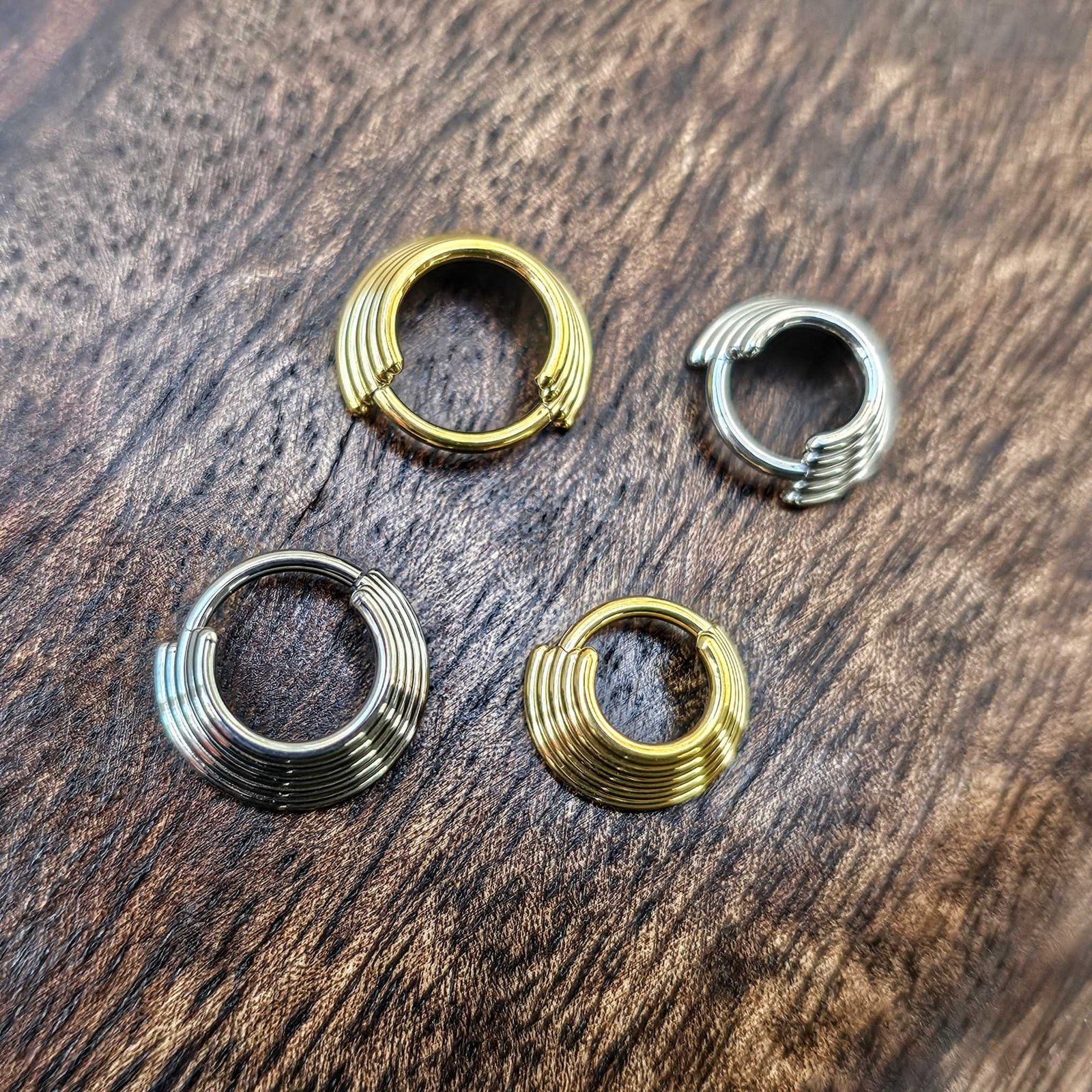 Embolden your look with this quadruple-layered coil septum clicker, a bold and eye-catching statement piece. Designed with multiple stacked loops that create a coiled, textured effect and extra depth, this unique septum ring adds a flashy flare to any outfit. Made of polished surgical steel and available in silver or gold tones, it’s the perfect blend of edgy and elegant.
