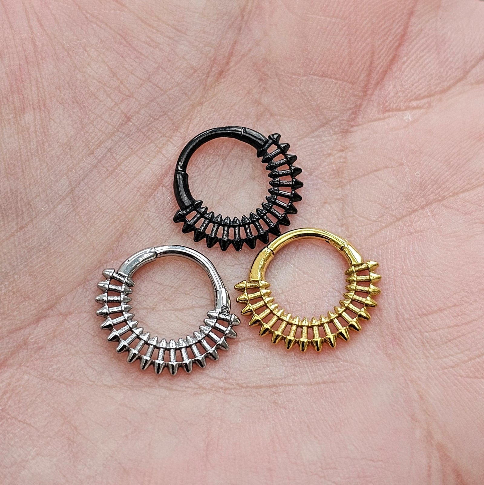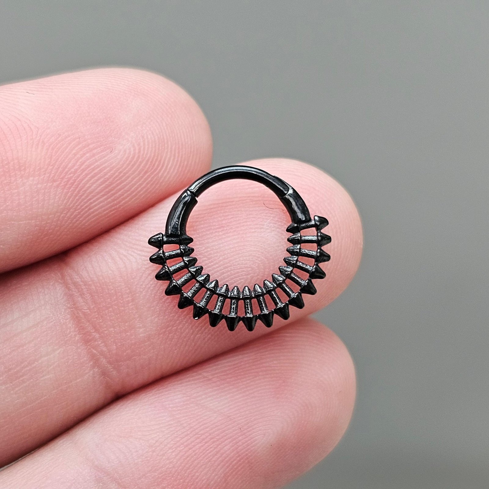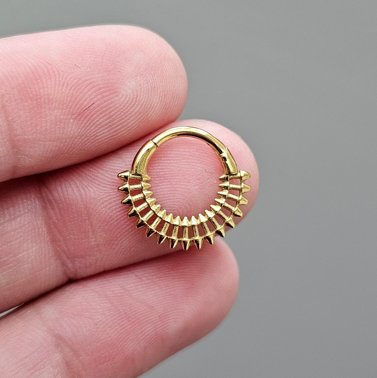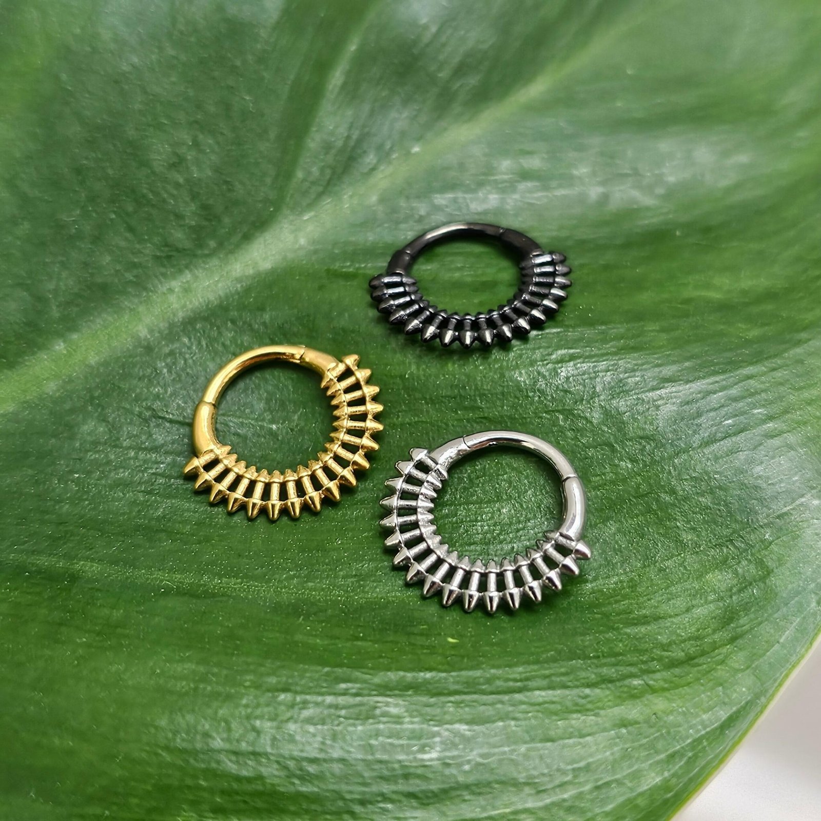 Make a bold statement with this 10mm tribal-inspired spike septum clicker, designed for those who love edgy and unique piercing jewelry with attitude. Featuring a double-edged spike pattern, this clicker combines a tribal aesthetic with modern style. Available in black, gold, and silver finishes, it’s the perfect piece to match any look.